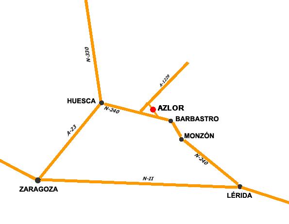 Azlor se sitúa junto a la carretera A-1229 con un buen acceso y una buena comunicación entre Barbastro, Monzón y Huesca.